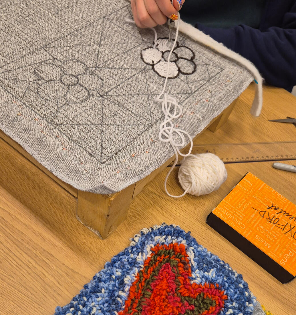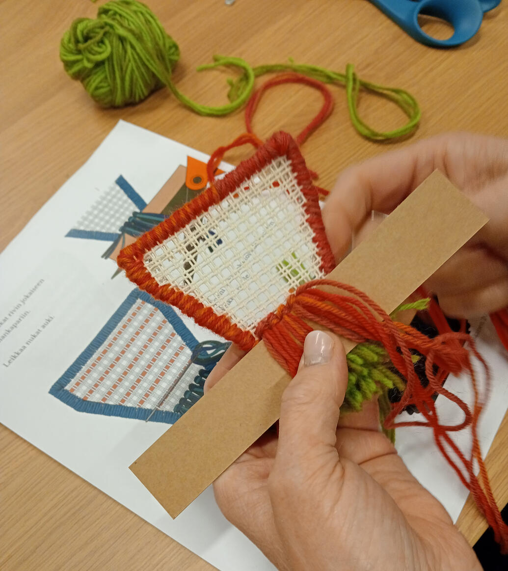 30.1.2026 Ryijykorutyöpajassa tutustuttiin ryijyn tekemisen tekniikkaan rennoissa tunnelmissa ja valmistettiin pieniä ryijykoruja.SKY ry:n tekstiilisuunnittelija Sonja Tanskanen